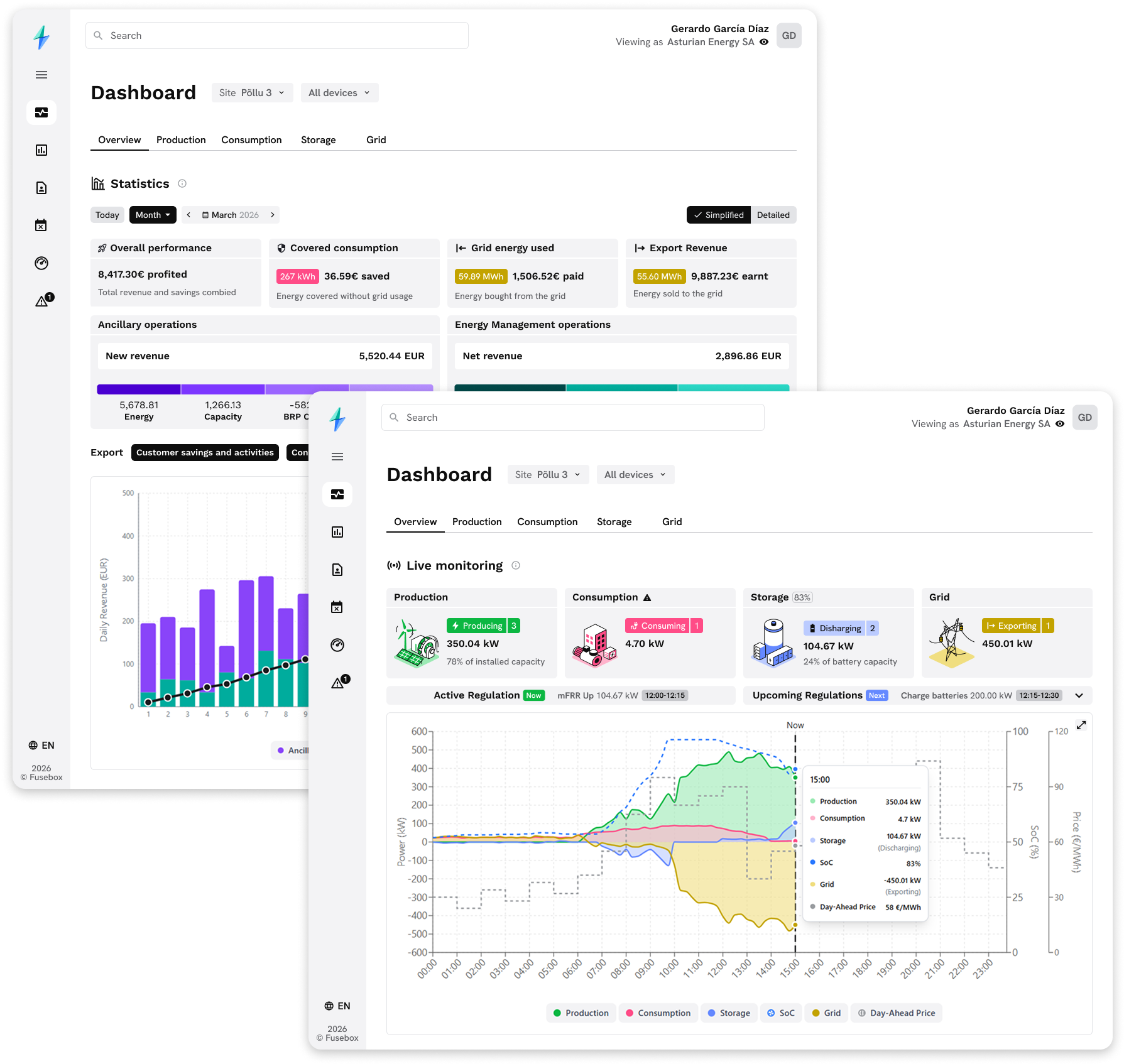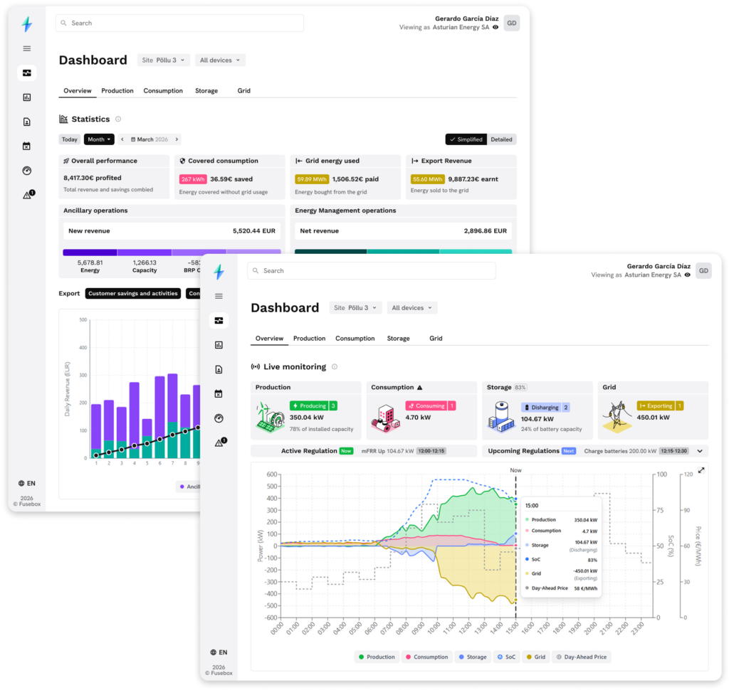 Fusebox OS provides the core infrastructure: site-level optimization, real-time dispatch, and end-to-end ancillary market workflows. Use it as a standalone system or connect it to your existing trading desk and forecasting tools via open APIs.